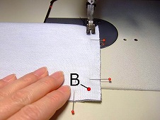 まず、どちらかの端の約5mm手前から縫い始め、次の辺の5mm手前(写真 :B点)まで縫ったら