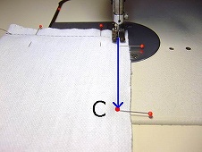 「押さえ金」を上げて、布地を90度回して方向転換し、続けてうっておいた目印のまち針のところ(写真 :C)まで縫います。(縫い代は全て1cm) ※ここでは、説明用に目立つ色のミシン糸を使用しています。