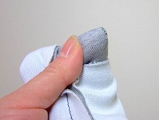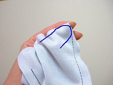 まず、4つの角を全て斜めに切り落とし、 縫い残しておいた【返し口】から、指を入れて、角のところに親指の先を差込み、人差し指で縫い代を後ろへ倒します。