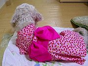 興味深深で見ているワンコの視線を感じ、頑張って作りました。それぞれ帯の長さや腰上げの寸法も違うので、どの浴衣にどの帯をあわせればいいのかわからなくなってはいけないと思い、帯についてはマジックテープで止めるのではなく、直接浴衣に縫いつけてしまいました。