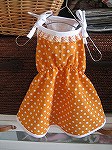 オレンジ地に白の水玉ワンピは前身頃を白地ニットで作り、クルミボタンをつけました。