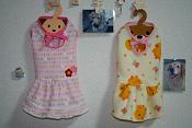 私、裁縫素人なんですが、今日一気に3着作りました。最初はシマシマで紺色のフチのあるやつです。Mサイズで作ったらかなり大きかったので、Sサイズで黄色いのを作りました。裾を四角くアレンジしてみました。(余計なことをしたのでヒヨヒヨしてしましました…)これでもまだ大きい感じだったので、SSサイズでシマシマのフチどり無し(フチのテープがなくなったのでサイズ合わせ用に)を作りました。ちょっと小さめだけど、型紙をアレンジすればぴったりしたモノが作れそうです♪作品募集中とのことなので、早速写真を送らせていただきます。(つたない作品ですが、HP掲載して頂けると嬉しいです)