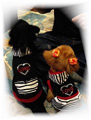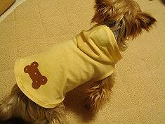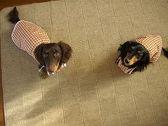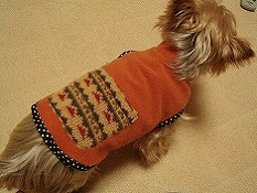 我家は二匹ともより胴長なので丈はずいぶん伸ばしました。バイヤステープを色違いにしています。写真はなかなか上手く撮れませんが添付します。写真(右側)はBerryが3ヶ月頃のわんこ服着用です。袖ぐりをリブで衿と同じような作りにしてます。この服は現在友人のチワワちゃんにおさがりしてます。次回の作品も楽しみにしております。