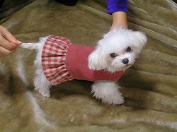 まず、愛犬りきのために一着。次に仲良しのお友達に一着。犬種は違うのですが、サイズがほとんど同じなので...。それから...りきのおよめさんに、ワンピースを。はっきりわかる写真ではないのですが添付させていただきます。(およめさんのワンピースはまだ撮影してません..)